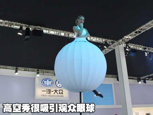 一個(gè)高高的桿子上面裝了一個(gè)雪白的球,球里面竟然冒出一個(gè)金發(fā)碧眼的美女!在大眾的展臺(tái)前,三位外國模特吸引了無數(shù)觀眾圍觀。 只見洋美女穿著雪白的裙子,爬上了一根高達(dá)3米的桿子,然后從腳下生出一個(gè)“雪球”,“雪球”把人的下半身都包裹在內(nèi),只露出上半身。三個(gè)高桿,三位美女,在空中擺出各種舞蹈姿勢,瞬間秒殺了無數(shù)相機(jī)。
