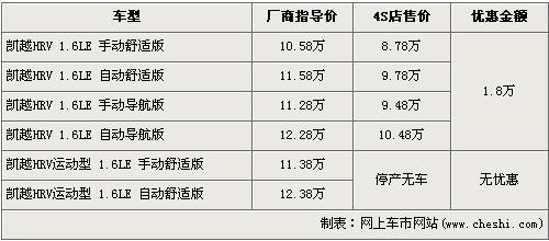 據(jù)經(jīng)銷商處銷售人員介紹,凱越HRV共有6個(gè)車型,由于運(yùn)動(dòng)版車型現(xiàn)已停產(chǎn),經(jīng)銷店內(nèi)已經(jīng)沒有現(xiàn)車,所以在售的車型只有舒適版和導(dǎo)航版共4款車型。近期購買凱越HRV的消費(fèi)者可以得到1.8萬元的現(xiàn)金優(yōu)惠,經(jīng)優(yōu)惠后,入門級(jí)的1.6LE手動(dòng)舒適版車型售價(jià)從廠商指導(dǎo)價(jià)10.58萬元跌至8.78萬元。