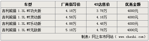 熊貓作為吉利全球鷹品牌下的代表產品,在去年上市后受到了眾多消費者的青睞。網上車市網站了解到,在自動檔車型上市后,在售的手動車型也將全面升級,將不受市場歡迎的負壓式后窗全面升級為電動升降后窗。而價格上沒有任何變化,經銷商處全系仍可給出4000元優(yōu)惠。詳情如下: