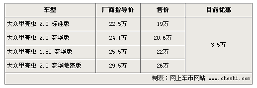 據(jù)4S店銷售人員介紹:目前甲殼蟲(chóng)全系可優(yōu)惠3.5萬(wàn)元,2.0標(biāo)準(zhǔn)版售價(jià)僅為19萬(wàn),但目前硬頂版甲殼蟲(chóng)無(wú)現(xiàn)車,訂車需等半個(gè)月至兩個(gè)月。敞篷版目前現(xiàn)車較充足,喜歡的朋友可以不必等待漫長(zhǎng)的訂車時(shí)間。