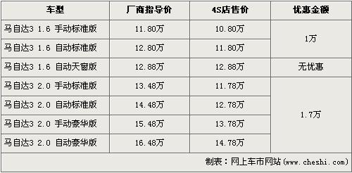 長安馬自達旗下主力車型-馬自達3以1.6L車型于06年開場,隨后又為車系注入了2.0L車型,2年時間馬3憑借動感的外觀以及優(yōu)越的性能博得了消費者的喜愛。今年的4月2日長安馬自達又為消費者帶來了1.6L的自動天窗版車型,豐富了馬3的銷售車型。據(jù)了解,近期購買馬自達3的消費者可以得到最高1.7萬元的優(yōu)惠,具體詳情請看下表: