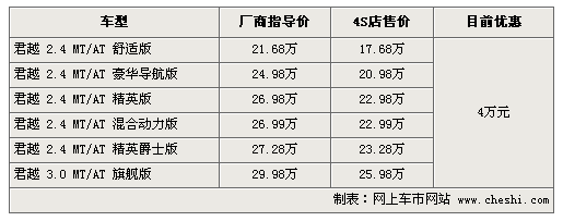 據(jù)4S店銷售人員介紹:由于新君越臨近上市,所以目前銷售的君越有大幅降價(jià),最高降幅達(dá)到4萬(wàn)元。目前除了混合動(dòng)力版需預(yù)定外,其他車型貨源充足,全系優(yōu)惠4萬(wàn)元;旌蟿(dòng)力版預(yù)訂需等一個(gè)月時(shí)間,訂金1萬(wàn)元。