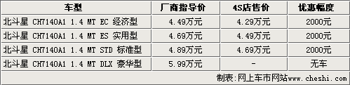 據(jù)昌河鈴木4S店銷售人員介紹,北斗星目前車型比較齊全,只有豪華型沒有現(xiàn)車銷售。其他三款車型都可以優(yōu)惠2000元。另外,北斗星AMT版本將會在近期到店,目前還沒有這款車的售價及具體到店日期,所以還不能接受預訂。