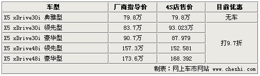 據(jù)4S店銷售人員介紹:目前寶馬X5除3.0升典雅型無車外,其它車型可打9.7折,最大優(yōu)惠達5.2萬元之多。但是目前X5無現(xiàn)車,預定最短需等一個半月,4.8升車型最長需等半年。雖然目前X5優(yōu)惠幅度較之前有所縮水,但目前無現(xiàn)車的狀態(tài)能有小幅優(yōu)惠也算是一個小的驚喜。