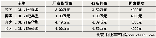 據(jù)長安轎車4S店銷售人員介紹,奔奔目前現(xiàn)車都比較齊全,但與上月相比,優(yōu)惠幅度明顯有所減少。目前奔奔1.3L四款車型只能優(yōu)惠4000元,比上個月少1000元。但銷售人員也表示,如果消費者到店詳談,還可能有進一步優(yōu)惠的余地。
