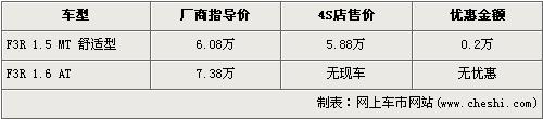 據(jù)比亞迪汽車北京地區(qū)4S店銷售人員介紹,目前北京在售的比亞迪F3R有兩款車型。1.5L手動舒適版經(jīng)2000元的優(yōu)惠后售價從6.08萬降到了5.88萬元,1.6L自動檔車型目前店內(nèi)沒有現(xiàn)車,所以不再此次優(yōu)惠隊(duì)列中。