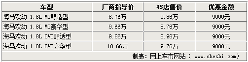 經(jīng)銷商表示,海馬歡動1.8L排量車型,最低配的手動舒適型售價8.76萬,最高配的自動(CVT)豪華型售價10.66萬,優(yōu)惠金額均為9千元,除現(xiàn)金優(yōu)惠外還會有相應的裝飾贈送,F(xiàn)金優(yōu)惠配合購置稅優(yōu)惠,則大大減輕了消費者的購車負擔。