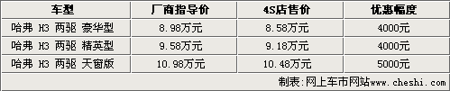 據(jù)長城汽車4S店銷售人員介紹,長城哈弗H3的現(xiàn)車都比較齊全,并且出現(xiàn)了較多的優(yōu)惠幅度。其中豪華型和精英型能夠優(yōu)惠4000元,而天窗版則優(yōu)惠5000元。另外銷售人員表示,長城哈弗H3的廠商指導(dǎo)價(jià)只是白色普通漆車型,金屬漆其他顏色車型需要加價(jià)2000元。