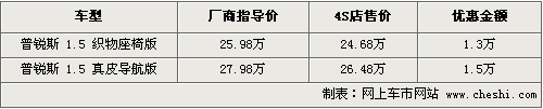 豐田普銳斯是豐田公司開發(fā)的一款混合動力車,是較為成熟的環(huán)保車型,自進入國內(nèi)市場后一直受到消費者的歡迎。普銳斯獨特的環(huán)?萍紴楹髞淼幕旌蟿恿囆吞峁┝私梃b。目前筆者了解到,普銳斯的售價出現(xiàn)了一定幅度的松動,最高可優(yōu)惠現(xiàn)金1.5萬元,具體車型以及價格如下列表: