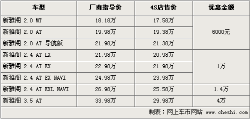 廣州本田新雅閣是中級車市場最暢銷的車型之一,也是廣州本田的旗艦車型。目前新雅閣在原來優(yōu)惠基礎上,車價有一定幅度的變化,其中最高優(yōu)惠幅度達到了4萬元,具體車型以及價格如下列表: