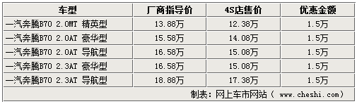 談及老款B70車型,各家銷售人員均表示北京個各展廳內(nèi)09款奔騰B70現(xiàn)車充足,店內(nèi)現(xiàn)車近段時間優(yōu)惠幅度較大,全系車型均可以給出1.5萬元的優(yōu)惠,相比前一段時間的1.1萬元優(yōu)惠幅度有所提升,F(xiàn)階段銷售較快的型號主要是2.0L的導(dǎo)航版車型,以及2.3L高配的兩款車型。