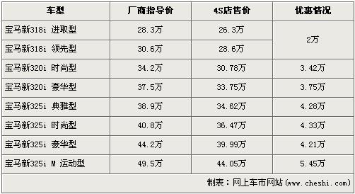 新寶馬3系在去年12月份正式在國內(nèi)市場正式上市銷售,經(jīng)過改款后的3系從外觀的流線,到內(nèi)飾的風(fēng)格均有一定程度的變化,帶給消費(fèi)者的是全新的視覺沖擊和駕馭樂趣。根據(jù)網(wǎng)上車市價格監(jiān)測系統(tǒng)顯示,新寶馬3系車型全系出現(xiàn)了不同的現(xiàn)金優(yōu)惠,最高優(yōu)惠達(dá)到了5.45萬元,具體車型價格如下: