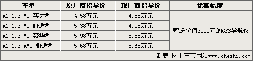 據(jù)奇瑞汽車4S店銷售人員介紹,奇瑞09款A1目前只有舒適型有現(xiàn)車銷售,原廠商指導價為5.38萬元,官方降價后為4.98萬元。A1 1.3L豪華型和新增加的實力型和自動擋目前都沒有現(xiàn)車,預訂需要等1-2周才能提到現(xiàn)車。目前購買奇瑞A1全系車型,都可以贈送一款價值3000元的GPS導航儀一部。