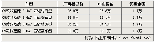 歐藍(lán)德是三菱汽車第一款采用轎車底盤形式生產(chǎn)的SUV,沿用了三菱Lancer(藍(lán)瑟)轎車的平臺,具有轎車乘坐的舒適性,同時(shí)它又有SUV的特性。根據(jù)網(wǎng)上車市價(jià)格檢測系統(tǒng)顯示,目前歐藍(lán)德車型主要為09款車型,最高讓利達(dá)1.7萬元。具體車型以及價(jià)格如下: