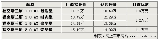 據(jù)4S店銷售人員介紹:目前福克斯三廂1.8升三款車型現(xiàn)車充足,尤其銀色、灰色、藍(lán)色、黑色車型現(xiàn)車較多,手動(dòng)擋車型目前優(yōu)惠1.4萬元,優(yōu)惠后僅售10.49萬元,1.8升自動(dòng)版車型優(yōu)惠1.2萬元。2.0升車型目前現(xiàn)車較少,顏色也不齊全,訂車需等待3周左右,目前優(yōu)惠1.1萬元。