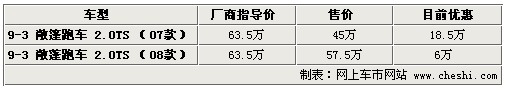 據(jù)4S店銷售人員介紹:目前薩博9-3敞蓬轎車08款車型最高優(yōu)惠6萬元,07款車型更是達到18.5萬元。無論是小編還是經(jīng)銷商處,都建議購買07款車型。08款與07款車型最大區(qū)別在于前臉部設計,在機械方面及舒適方面均無差別。目前店內(nèi)無現(xiàn)車,但是預訂07款車型僅需等待5天時間,預訂08款車型需等待2周時間。作為一款整車進口車型,訂車時間還是非常短的。