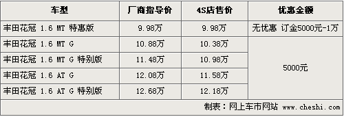 據(jù)4S店銷(xiāo)售人員介紹,花冠特惠版車(chē)型在配置方面比現(xiàn)在標(biāo)準(zhǔn)版有所減少,其中包括減少了遙控鑰匙、前進(jìn)氣格柵的鍍鉻裝飾條,揚(yáng)聲器由4個(gè)減少為2個(gè),其他方面并沒(méi)有明顯變化,F(xiàn)在這款車(chē)定金為5000元-1萬(wàn)元,最快月底到店,10月份將全面到店。同時(shí)現(xiàn)售的車(chē)型價(jià)格方面可以優(yōu)惠5000元現(xiàn)金,但現(xiàn)車(chē)數(shù)量不多,仍需要預(yù)訂。