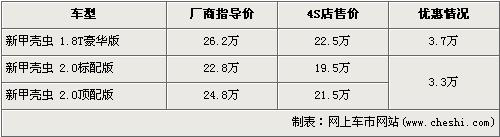 甲殼蟲是一款出自于PQ34平臺的轎車,它與我們熟知的高爾夫共平臺生產。不過在國內,它的“身份”卻被提升了很多,絕對的超過高爾夫的價格。正因這是一款小眾車型,所以它顯得彌足珍貴,再加上甲殼蟲圓潤、小巧、動感的外形,所以它給我們的印象非常親切。近日據(jù)網上車市價格系統(tǒng)監(jiān)測顯示,甲殼蟲出現(xiàn)了最高3.7萬元的優(yōu)惠,具體價格詳情請看下表:
