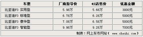 比亞迪F3系列車市一直都是自主家用車市場(chǎng)中的寵兒,在推出了白金版以及全新的智能性車型之后,更是吸引了消費(fèi)者的關(guān)注。網(wǎng)上車市網(wǎng)站近期又比亞迪4S店處了解到,現(xiàn)在各家店內(nèi)的車型均較為齊全,根據(jù)不同的車型最高可給出7000元的優(yōu)惠。詳情如下: