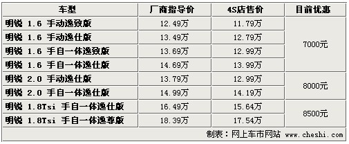 據(jù)4S店銷售人員介紹:目前明銳全系最高優(yōu)惠8500元,部分車型無現(xiàn)車,預定需等待1個半月至3個月時間。1.6升車型優(yōu)惠已達7000元,較之前優(yōu)惠幅度增加了1000元。2.0升車型優(yōu)惠仍為8000元,但個別經(jīng)銷商處有銀色、灰色現(xiàn)車,不過優(yōu)惠幅度最高僅6000元。1.8TSI的兩款車型優(yōu)惠8500元,較之前有所縮水,但目前經(jīng)銷商處有現(xiàn)車,顏色也較齊全。雖然1.6升車型優(yōu)惠幅度較之前有所增加,但目前依然沒有現(xiàn)車,需要預訂。如在店內(nèi)做裝飾還可打8折,雖然折后裝飾價格仍有些偏高,但產(chǎn)品質(zhì)量可以保證。