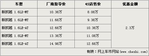 據(jù)4S店銷售人員介紹,新凱越分為1.6L與1.8L兩種排量車型,目前新凱越全系優(yōu)惠2.3萬元,較上個月的優(yōu)惠降幅有所上升。經(jīng)優(yōu)惠后,全系最低配的1.6LX-MT車型售價下降到了8.08萬元。經(jīng)優(yōu)惠后,1.8L手動和自動兩款車型售價也下降到了11.08萬元和12.68萬元。銷售人員還介紹,目前店內(nèi)現(xiàn)車齊全,是消費者挑選的較好時機。