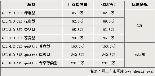據(jù)北京奧迪經(jīng)銷店銷售人員介紹,2.8L和近期剛上市的3.0L店內(nèi)有現(xiàn)車,并且購買的消費者可以得到3萬元的優(yōu)惠。經(jīng)優(yōu)惠后,全系最低配的2.8 FSI標(biāo)準(zhǔn)版售價從85.8萬元下降到了82.8萬元。銷售人員還介紹,4.2L以及6.0L Quattro版車型均無現(xiàn)車,欲購買著需交10萬訂金,等半年左右才可提車。