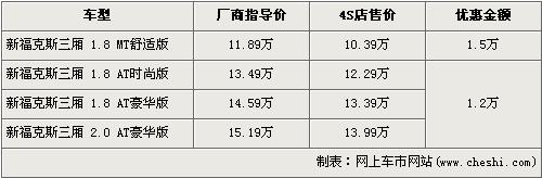 福克斯憑借出色的外觀設(shè)計(jì)及極佳的操控性贏得了市場(chǎng)的認(rèn)可,在銷量方面一直保持迅猛的勢(shì)頭。尤其新款福克斯的上市,一改內(nèi)飾略顯粗糙的詬病,使得?怂垢呌谕昝。福克斯采用了沃爾沃S40底盤,將操控進(jìn)行到底,這一優(yōu)勢(shì)博得全世界的掌聲,名副其實(shí)成為了這個(gè)級(jí)別的標(biāo)桿車型。據(jù)網(wǎng)上車市價(jià)格系統(tǒng)檢測(cè)顯示,目前三廂?怂谷底罡邇(yōu)惠1.5萬元,具體車型價(jià)格請(qǐng)看下表: