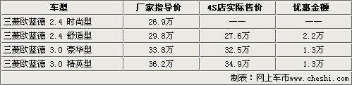 歐藍(lán)德是三菱引入國內(nèi)銷售的中型SUV車型,同時(shí)歐藍(lán)德也是三菱汽車第一款采用轎車底盤形式生產(chǎn)的SUV車型。近日我們從三菱汽車官方獲悉到,全新一代的歐藍(lán)德車型將于10月13日正式上市,首次推出的車型分為2.4和3.0兩種排量,共計(jì)4款車型。與此同時(shí)根據(jù)網(wǎng)上車市價(jià)格監(jiān)測系統(tǒng)顯示,目前銷售的09款歐藍(lán)德全系均出現(xiàn)了大幅優(yōu)惠,最高降幅高達(dá)2.2萬元。具體車型售價(jià)見下表: