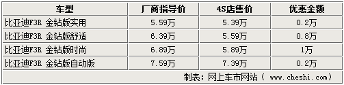 比亞迪F3R在推出金鉆版系列車型之后,受到很多消費(fèi)者的關(guān)注與喜愛(ài)。金鉆版比亞迪F3R車型增加到了3款,全系售價(jià)區(qū)間為5.59萬(wàn)元-7.59萬(wàn)元。網(wǎng)上車市網(wǎng)站了解到,近日比亞迪F3R時(shí)尚型最高可優(yōu)惠10000元,其他車型也可優(yōu)惠2000到8000元不等。詳情如下: