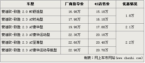 福特蒙迪歐-致勝出自福特最新開(kāi)發(fā)的EUCD技術(shù)平臺(tái),它采用了沃爾沃S80底盤技術(shù)。在歐洲,蒙迪歐致勝與皇冠成為競(jìng)爭(zhēng)對(duì)手,是一款定位高于雅閣、凱美瑞之流的轎車。近日據(jù)網(wǎng)上車市價(jià)格系統(tǒng)檢測(cè)顯示,蒙迪歐-致勝全系最高優(yōu)惠2.2萬(wàn)元,具體車型價(jià)格詳情請(qǐng)看下表: