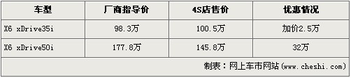 據(jù)北京寶馬經(jīng)銷店銷售人員介紹,現(xiàn)在在售的X6車型分為售98.3萬(wàn)元的35i車型和售價(jià)為177.8萬(wàn)元的50i兩款車型。目前購(gòu)買35i車型的消費(fèi)者沒有優(yōu)惠,提現(xiàn)車還要加價(jià)2.5萬(wàn)元,售價(jià)從98.3萬(wàn)元上升到了100.8萬(wàn)元,排量更大的4.4升的50i車型有32萬(wàn)元的現(xiàn)金優(yōu)惠,售價(jià)降到了145.8萬(wàn)元。銷售人員還介紹,近期50i車型車型沒有現(xiàn)車,消費(fèi)者需交訂金10萬(wàn)元,下個(gè)月可提車。