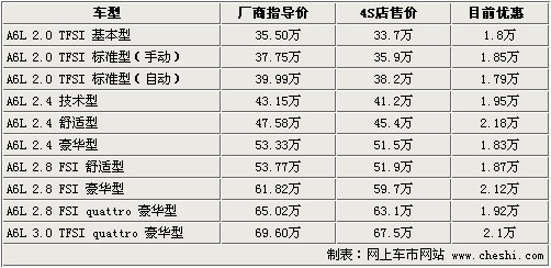據(jù)4S店銷售人員介紹:目前2010款?yuàn)W迪A6L車系部分車型有現(xiàn)車,2.0T與2.4升車型現(xiàn)車較為充足,顏色包括銀色和黑色,每款車型具體情況有所不同。2.8升排量車型目前現(xiàn)車較少,只有個(gè)別款有現(xiàn)車,顏色為黑色,如需預(yù)定需等1個(gè)月以上。優(yōu)惠方面,奧迪A6L全系最高優(yōu)惠2.18萬(wàn)元,優(yōu)惠幅度較穩(wěn)定。