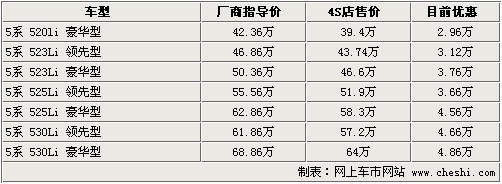 據(jù)4S店銷售人員介紹:目前寶馬5系最高優(yōu)惠4.86萬元,部分車型有現(xiàn)車。520Li領(lǐng)先型由于銷量不好,所以暫時(shí)停產(chǎn),目前2.0排量車型只有520Li豪華型。523Li系列車型只有523Li豪華型有現(xiàn)車,但顏色不全只有銀色黑內(nèi)飾車款,如預(yù)定523Li領(lǐng)先型需等1-2個(gè)月時(shí)間。525Li系列豪華型有現(xiàn)車,顏色為銀色、白色及灰色,525Li領(lǐng)先型車款預(yù)訂需等1個(gè)月時(shí)間。530Li領(lǐng)先型有金色、銀色現(xiàn)車,530Li豪華型有灰色現(xiàn)車。目前最高優(yōu)惠可達(dá)4.86萬元,優(yōu)惠幅度較大。