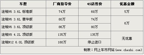 途銳是大眾首款引進我國的SUV車型,在3.6L及4.2L率先上市后,大眾為了滿足消費者的更大胃口,緊接著又推出了搭載12缸發(fā)動機的6.0L車型。隨著大排量消費稅的頒布,給9月份后入關的大排量車型帶來了一次不小的沖擊,令大排量汽車價格都上調了不少。近日據(jù)網上車市價格系統(tǒng)監(jiān)測顯示,大眾途銳的6.0L車型已經停止進口,并且購買目前購車可以得到最高6萬元的優(yōu)惠,具體詳情請看下表: