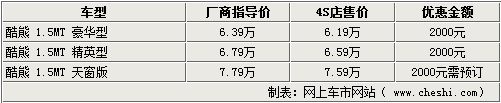 酷熊作為長城汽車在市場上推出的第三款轎車產(chǎn)品,憑借極具個性的造型和寬大的內(nèi)部空間,使很多消費(fèi)者都對其非常感興趣。新車價格分別為豪華型6.39萬元、精英型6.79萬元,天窗版7.79萬元。近日,網(wǎng)上車市網(wǎng)站了解到,長城汽車4S店處的天窗版酷熊仍然處在無車銷售的狀態(tài),其他兩款車型有現(xiàn)車銷售,可以給出2千元的優(yōu)惠。具體詳情如下: