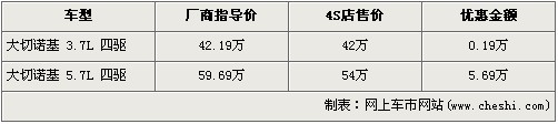 據(jù)經(jīng)銷商銷售人員介紹,大切諾基3.7L車型的優(yōu)惠金額僅為1900元,而高排量的5.7L車型優(yōu)惠金額達(dá)到了5.69萬(wàn)元,達(dá)到了全系的最高。在售的Jeep-大切諾基共分為3.7L四驅(qū)和5.7L四驅(qū)兩個(gè)車型。3.7L四驅(qū)型經(jīng)1900元優(yōu)惠后,售價(jià)降為了42萬(wàn)元。而排量稍大的5.7L四驅(qū)型經(jīng)5.69萬(wàn)元優(yōu)惠后,售價(jià)降為了54萬(wàn)元。