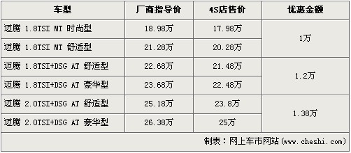 據(jù)北京一汽大眾經(jīng)銷(xiāo)店銷(xiāo)售人員介紹,邁騰全系車(chē)型全系最高優(yōu)惠1.38萬(wàn)元。經(jīng)1萬(wàn)元的優(yōu)惠后,全系入門(mén)級(jí)的1.8TSI MT時(shí)尚型的售價(jià)從18.98萬(wàn)元下降到了17.98萬(wàn)元。全系最高配的邁騰2.0TSI豪華版經(jīng)1.38萬(wàn)元優(yōu)惠后,售價(jià)降到了25萬(wàn)元。銷(xiāo)售人員還介紹,目前店內(nèi)邁騰全系有現(xiàn)車(chē)。