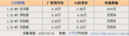 近日,筆者從北京吉利4S店了解到,目前該車的優(yōu)惠幅度比較穩(wěn)定,手動擋車型功夫版外均有4000元的現(xiàn)金優(yōu)惠,但現(xiàn)車方面僅有功夫版車型有少量現(xiàn)車,有意向購買的消費(fèi)者可要抓緊了。詳情請見下表: