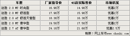 北京現(xiàn)代途勝是韓系車中非常經(jīng)典的一款城市型SUV,寬大的空間,時尚的外觀以及人性化的配置使眾多消費者都鐘情它,從上市到現(xiàn)在在SUV市場中一直有著不錯的銷量。近日根據(jù)網(wǎng)上車市價格監(jiān)測系統(tǒng)顯示,目前購買現(xiàn)代途勝車型最高可以得到2.5萬的現(xiàn)金優(yōu)惠。具體車型見下表: