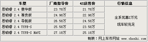 東風(fēng)本田旗下的首款運動中高級車型——思鉑睿于09年9月初上市,全系共計五款車型,售價為23.78萬元—27.18萬元。上根據(jù)網(wǎng)上車市價格監(jiān)測系統(tǒng)顯示,目前購買思鉑睿全系可優(yōu)惠現(xiàn)金2萬元,現(xiàn)車方面較為齊全。具體車型行情如下: