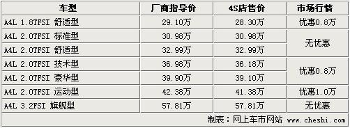 據(jù)北京一汽奧迪經(jīng)銷店銷售人員介紹:目前A4L全系現(xiàn)車比較齊全,除1.8TFSI及3.2L車型現(xiàn)車較少以外,其余車款均有現(xiàn)車,F(xiàn)車顏色主要有銀色、灰色、紅色等,如預定其他顏色車型需預定,預定最少等20天,最長等待1個半月。1.8TFSI及3.2L車型等待時間較長,需等3個月時間。優(yōu)惠方面,目前全系最高優(yōu)惠1萬元,其余車型均有8000元左右的優(yōu)惠幅度,F(xiàn)購車取消了加價,并還有一定幅度的優(yōu)惠,此時購車比較劃算,喜歡的消費者請及時與店內(nèi)聯(lián)系。