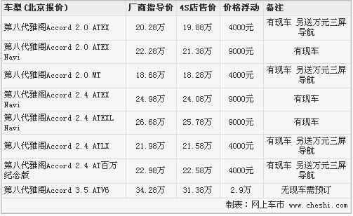 據(jù)廣汽本田4S店銷售人員介紹,目前雅閣全系現(xiàn)車供應(yīng)較為充足,顏色方面也比較齊全。3.5排量最高可優(yōu)惠近3萬元,但該車為訂單式銷售需預(yù)訂。2.0及2.4排量車型的優(yōu)惠幅度較小,無導(dǎo)航車型可優(yōu)惠4000元,另贈(zèng)送價(jià)值萬元全車三屏導(dǎo)航。已帶有導(dǎo)航的車型可直接優(yōu)惠9000元。北京地區(qū)各4S店由于訂單不同,各店銷售的現(xiàn)車顏色有所不同,預(yù)購雅閣的消費(fèi)者可到店詳談,在價(jià)格上還會(huì)有進(jìn)一步的優(yōu)惠。