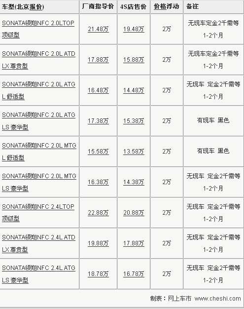 作為SONATA御翔的換代車型-----北京現(xiàn)代索納塔領(lǐng)翔于08年底正式上市銷售,是結(jié)合了韓國(guó)現(xiàn)代最先進(jìn)的造車技術(shù),憑借著大氣穩(wěn)重外形,寬大空間,乘坐性高,強(qiáng)勁動(dòng)力等較高的綜合性價(jià)比屹立于中級(jí)車之林。根據(jù)網(wǎng)上車市價(jià)格監(jiān)測(cè)系統(tǒng)顯示,目前領(lǐng)翔全系現(xiàn)金優(yōu)惠2萬(wàn)元,現(xiàn)車不全,具體車型需預(yù)定,具體行情如下: