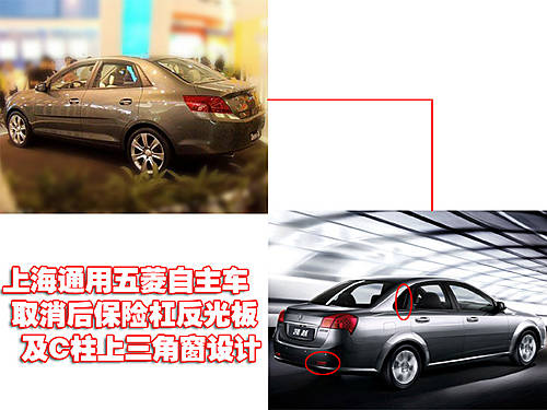 上海通用五菱自主轎車采用一體式設(shè)計(jì),替代了上海通用別克凱越的分體社尾燈,顯得更加飽滿。此外,別克凱越后保險(xiǎn)杠上的反光板和C柱上的三角窗設(shè)計(jì),均沒有出現(xiàn)在上海通用五菱自主轎車。