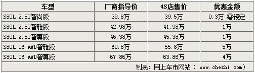 據(jù)4S店銷售人員介紹,全新的2010款S80L將于本月下旬到店開始銷售,除最高配的T6智尊版外,全系車型在配置上新增了GPS導(dǎo)航以及可視倒車影像等系統(tǒng),在外觀內(nèi)飾方面則換裝金屬裝飾條以及車內(nèi)裝飾等,價(jià)格上除T6智尊版外各款車型均比老款要增加了3千至4千元左右。目前國(guó)產(chǎn)09款沃爾沃S80L有部分現(xiàn)車,有銀色、金色車身外觀可供消費(fèi)者挑選,全系車型除最低配的車型外均有現(xiàn)車供應(yīng),最高優(yōu)惠達(dá)5萬(wàn)元。