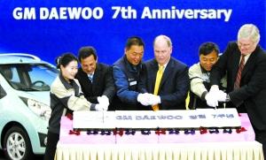 10月15日,韓國仁川,通用大宇慶祝7歲生日。通用汽車首席執(zhí)行官韓德勝(右三)、通用汽車公司執(zhí)行副總裁羅瑞立(右一)與通用大宇領導層切蛋糕。在當日的新聞發(fā)布會上,韓德勝稱,出售歐寶的談判仍在繼續(xù)進行。2001年10月17日,通用汽車與其合作伙伴鈴木汽車及上汽集團,共同收購了大宇汽車66.7%的股份。