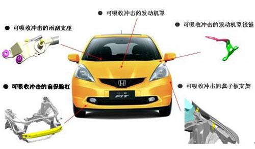 當行人與車輛發(fā)生交通事故時,最主要的死亡原因是來自于行人頭部的傷害,而最主要的重傷部位是腿部。如下圖所示,為了保護行人頭部,飛度的發(fā)動機罩、翼子板支架等部位采用了碰撞吸能結(jié)構(gòu);為了保護腿部,保險杠的前部也采用了碰撞吸能材料。