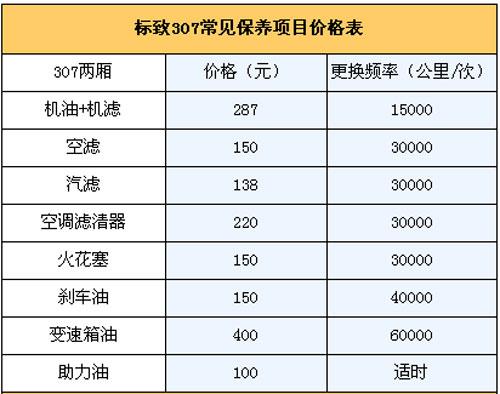 5.保養(yǎng)費(fèi): 我們向標(biāo)致4S店售后服務(wù)人員咨詢過,他們說307一大優(yōu)勢(shì)是保養(yǎng)周期比較長(zhǎng),1.5萬公里才需要保養(yǎng)一次,是同級(jí)車型中保養(yǎng)花費(fèi)最低的。通常新車首保在7500公里時(shí)進(jìn)行,以后每1.5公里保養(yǎng)一次。第二次1.5萬公里時(shí)的常規(guī)保養(yǎng)(更換機(jī)油機(jī)濾)需花費(fèi)287元;3萬公里保養(yǎng)(更換機(jī)油機(jī)濾+空濾+空調(diào)濾芯+汽濾+火花塞)為795元;4.5萬公里保養(yǎng)(更換機(jī)油機(jī)濾)花費(fèi)287元;6萬公里保養(yǎng)(更換機(jī)油機(jī)濾+空濾+空調(diào)濾芯+汽濾+火花塞)為795元。