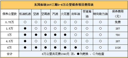 5.保養(yǎng)費: 我們向東風標致4S店售后服務(wù)人員咨詢過,東風標致207 三廂保養(yǎng)周期為1.5萬公里,首保在7500公里時進行。免費對各種配件進行檢查。1.5萬公里和4.5萬公里時都只需要進行普通保養(yǎng)(更換機油機濾),3萬公里保養(yǎng)時需要更換機油機濾和三濾以及火花塞;6萬公里時除了有和3萬公里相同的項目外,還需更換剎車油。6萬公里綜合下來下來一共需要花費2340元,平均一年兩萬公里保養(yǎng)費用大概780元。