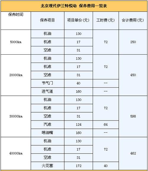 4.保養(yǎng)費:悅動的首保為5000km,以后每次的保養(yǎng)間隔為5000km。保修政策為2年/6萬公里保修(以先到為準(zhǔn))。第二次的10000km保養(yǎng)和首保內(nèi)容相同。那么如果一年行駛2萬km,悅動一年要做四次保養(yǎng)。由下表可知其除了第一年,以后每年的保養(yǎng)費用1500元。